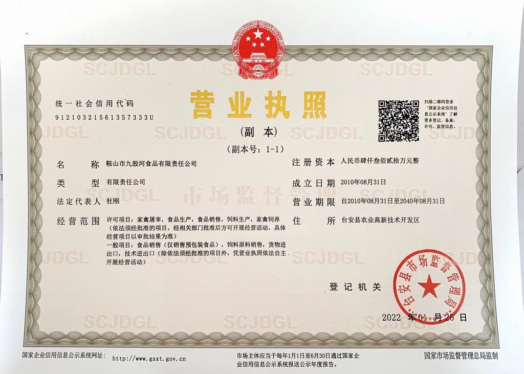 1997年丨九股河誕生于遼寧臺安,成立臺安縣九股河農業發展有限公司2003年丨九股河走進錦州市,在凌海成立凌海九股河食品有限公司2008年丨成立凌海九股河飼料有限公司2010年丨九股河與禾豐合作后,成立鞍山市九股河食品有限責任公司,從此,禾豐九股河走進了高速發展之路2011年丨繼續在遼西闊步,成立葫蘆島九股河食品有限公司同年,臺安縣九股河農業發展有限公司養殖部成立,按下規?;\養小區建設的快進鍵2